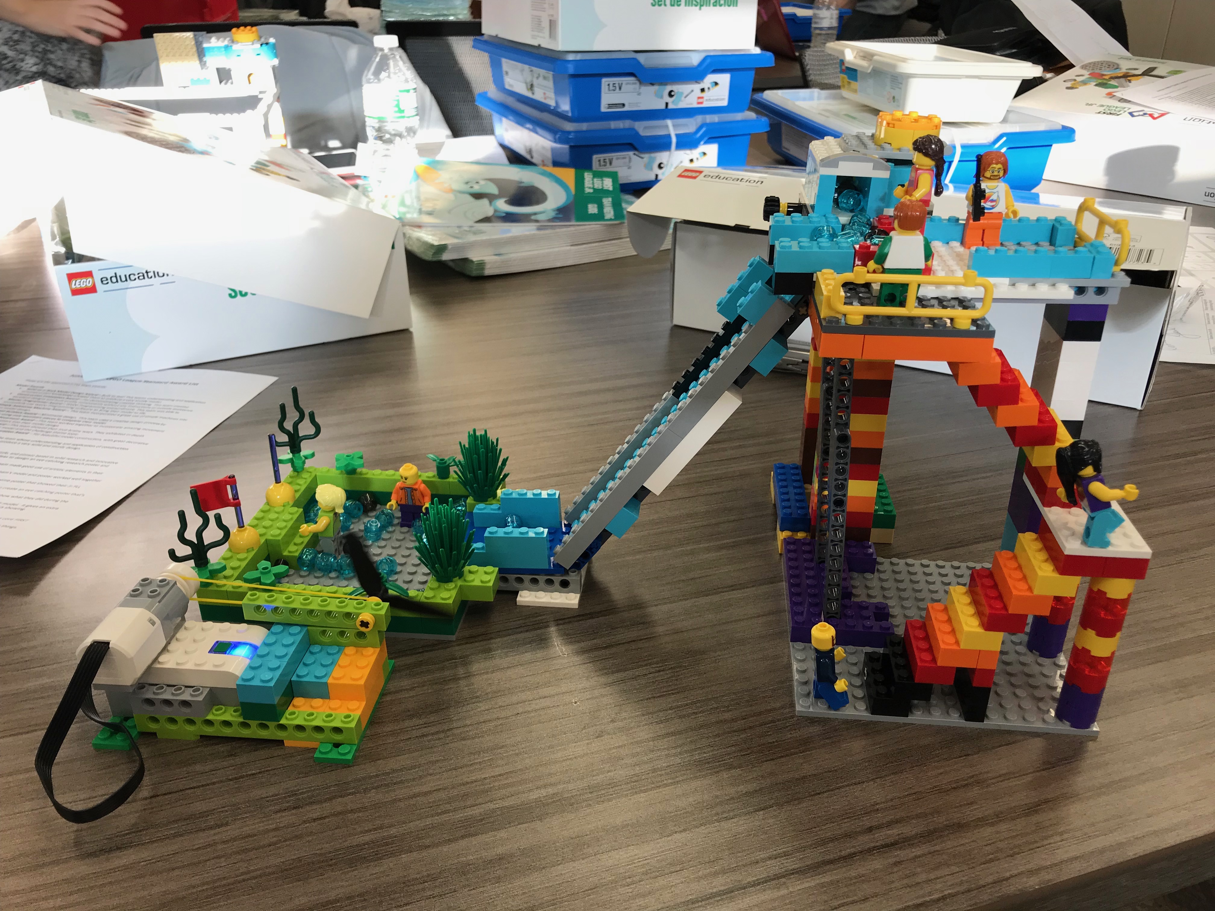 Recently we held the training for our 2nd annual NYC District 75 LEGOLeague. Our first event last year, held at the New York Hall of Science, was a resounding success that students and staff loved. Now we’re focusing on this year’s Aqua Adventure challenge. The goal is to create something that explores how you use water at home or in your community and improve on that design. Over the course of lunch, I was able to create a water slide design with a functioning water pump and fan. I particularly liked the lifeguard with the radio on top. Other teacher teams also created water designs as well including a moving fish in a tank.